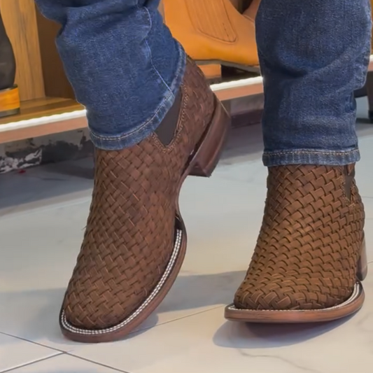 Black Basketweave Leather Boots- Square Toe